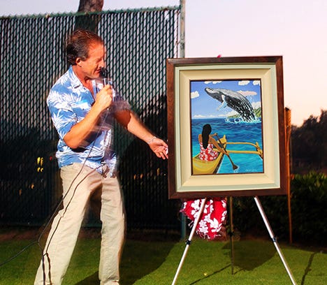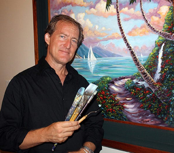 One of Hawaii’s acclaimed artists for 30 years, Michael’s wish is to share the primal beauty of island life. A self-trained artist, he began his career painting sand dollars collected while diving in Florida and selling them in his native Oklahoma. As a teen wandering the South Seas, Michael became fluent in traditional Polynesian culture. The islanders taught him to fish the reef, climb coconut palms and survive in the jungle. His primitive lifestyle was a major influence in his art. Later, Michael became managing editor of Samoa News in Pago Pago. He also wrote for USA Today, Associated Press, Pacific Magazine, and was honored with a Polynesian chief title in Samoa. Michael’s adventures with dolphins, whales and sharks hone his talent for sharing the wild beauty of the Pacific. He enjoys a busy family life with 5 children and his wife Sai, a Thai chef and avid gardener. Michael has been featured in Southwest Art, Islands, Delta Sky and Hawaii magazines. He has co-owned two galleries, was President of Lahaina Arts Society, and has been a featured artist in shows in Maui, Honolulu, Seattle and Tokyo. The Maui Oceanfront Marathon has made Michael the official Marathon Artist for over 8 years. He currently exhibits Monday’s 5 to 10 pm in the Four Season Maui’s “Artist’s Showcase” in Wailea and hosts client visits to his mountainside studio and home in Wailuku’s Maunaleo Estates. Once you connect with his art, you’ll find that no one does the islands quite like Michael Stark.