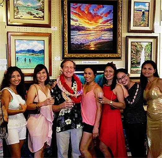 One of Hawaii’s acclaimed artists for 30 years, Michael’s wish is to share the primal beauty of island life. A self-trained artist, he began his career painting sand dollars collected while diving in Florida and selling them in his native Oklahoma. As a teen wandering the South Seas, Michael became fluent in traditional Polynesian culture. The islanders taught him to fish the reef, climb coconut palms and survive in the jungle. His primitive lifestyle was a major influence in his art. Later, Michael became managing editor of Samoa News in Pago Pago. He also wrote for USA Today, Associated Press, Pacific Magazine, and was honored with a Polynesian chief title in Samoa. Michael’s adventures with dolphins, whales and sharks hone his talent for sharing the wild beauty of the Pacific. He enjoys a busy family life with 5 children and his wife Sai, a Thai chef and avid gardener. Michael has been featured in Southwest Art, Islands, Delta Sky and Hawaii magazines. He has co-owned two galleries, was President of Lahaina Arts Society, and has been a featured artist in shows in Maui, Honolulu, Seattle and Tokyo. The Maui Oceanfront Marathon has made Michael the official Marathon Artist for over 8 years. He currently exhibits Monday’s 5 to 10 pm in the Four Season Maui’s “Artist’s Showcase” in Wailea and hosts client visits to his mountainside studio and home in Wailuku’s Maunaleo Estates. Once you connect with his art, you’ll find that no one does the islands quite like Michael Stark.
